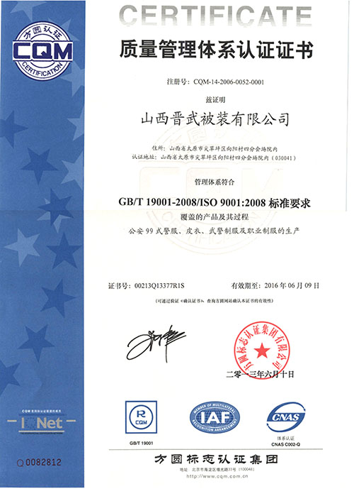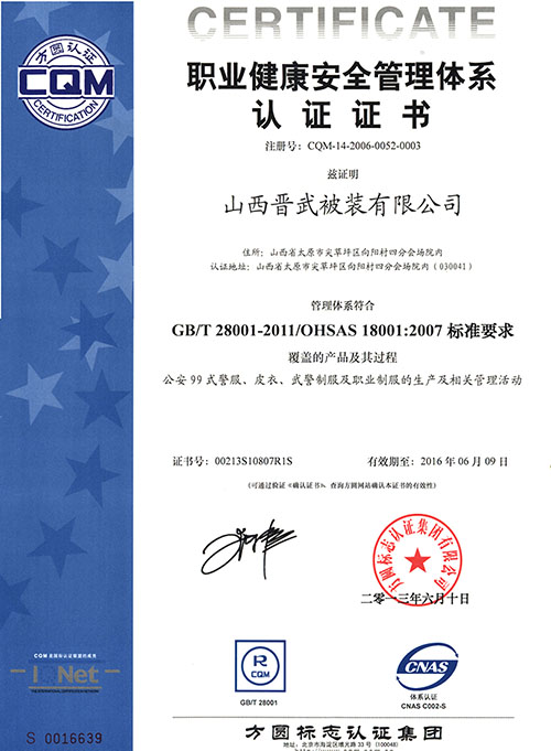 晉武被裝自1999年先后通過了ISO9001、ISO14001和OHS18001認(rèn)證,并在2009年被獲得了“中國優(yōu)質(zhì)產(chǎn)品”證書,同時先后從日本、德國、美國引進(jìn)先進(jìn)的生產(chǎn)設(shè)備和先進(jìn)的生產(chǎn)工藝,在2011年年初,我公司被評為“質(zhì)量、服務(wù)、信譽(yù)AAA級金牌單位”。